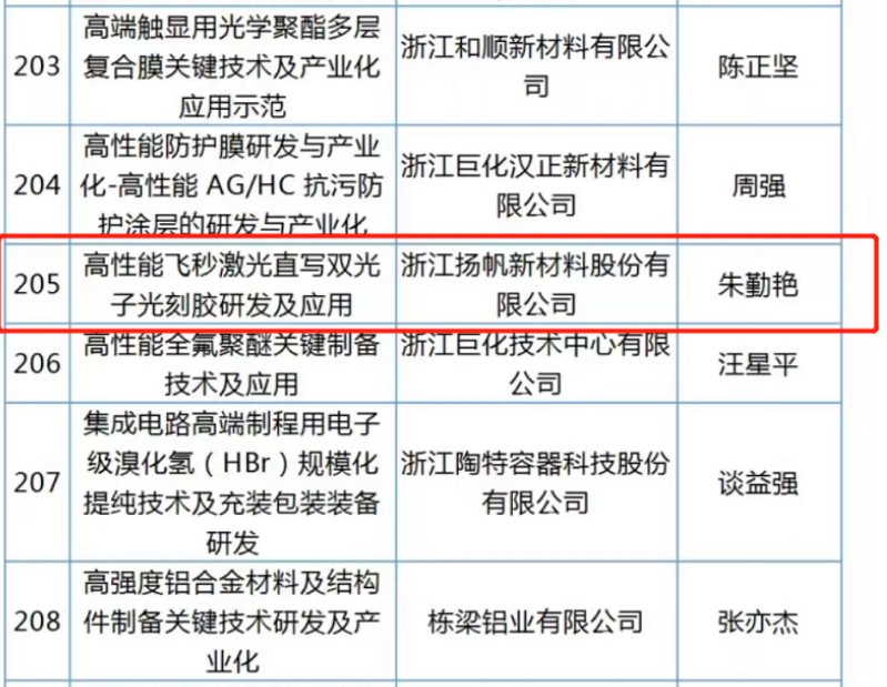 2022年11月15日,浙江省科學技術廳發布《關于2023年度第一批“尖兵”“領雁”研發攻關計劃項目立項的公示》,揚帆新材朱勤艷博士主持的項目“高性能飛秒激光直寫雙光子光刻膠研發及應用”成功入列。這是今年以來公司研發工作取得的又一可喜進展。同時,公司得到了紹興市上虞區人才發展大會的表彰并榮獲重才愛才“金梧桐獎”。