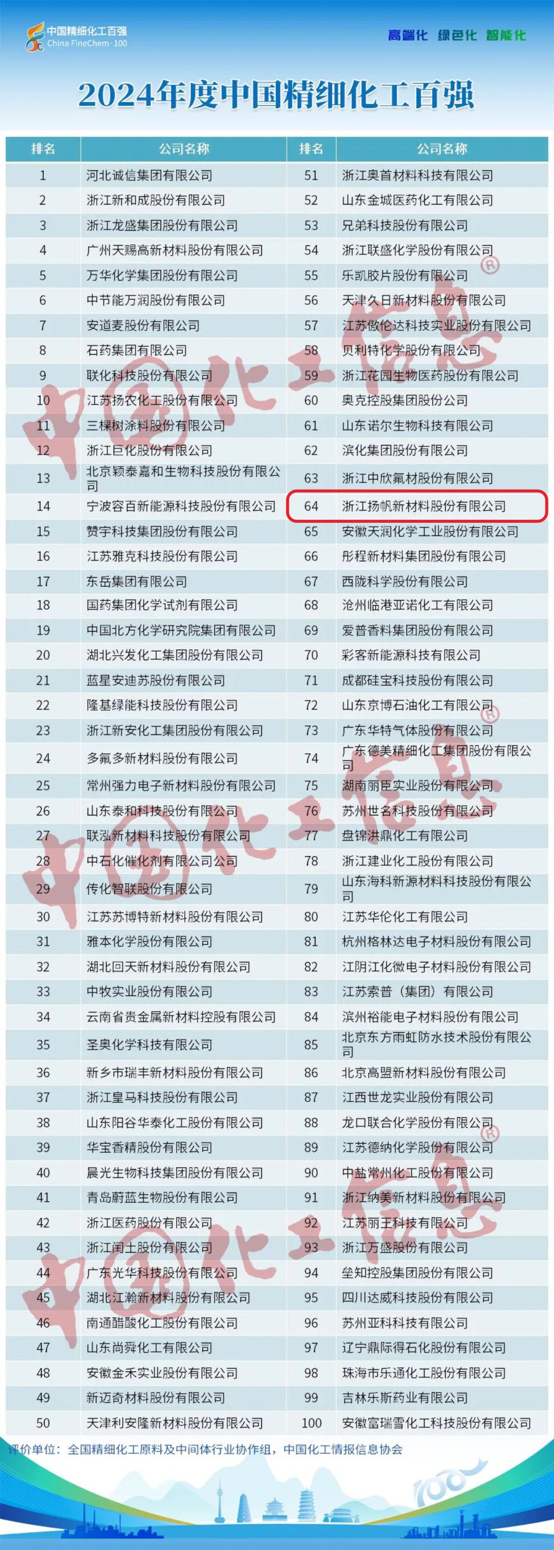 浙江揚帆新材料股份有限公司再度榮登中國精細化工百強,位居第64位,排名較去年上升9位。