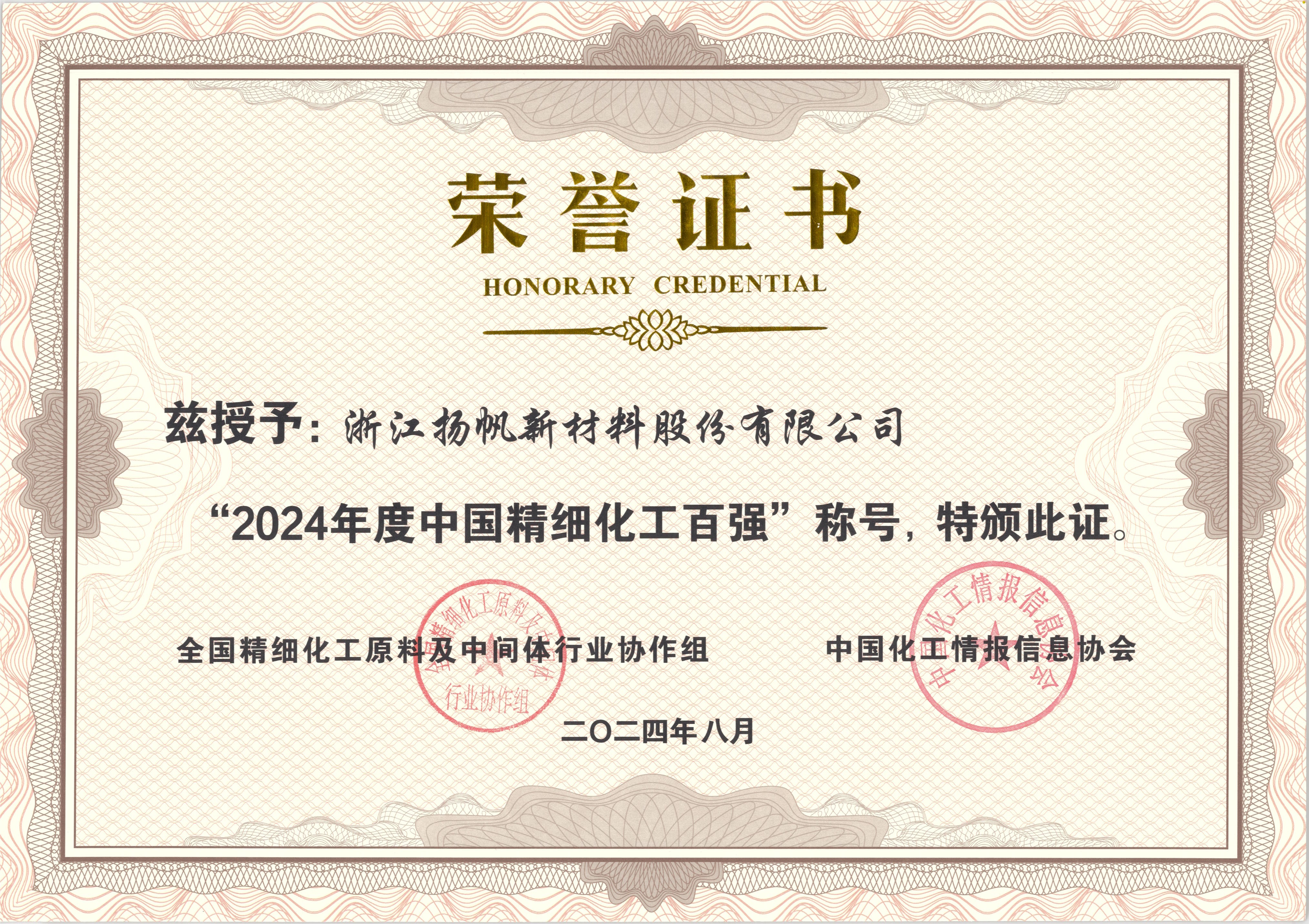 揚帆新材榮獲“2024年度中國精細化工百強”稱號
