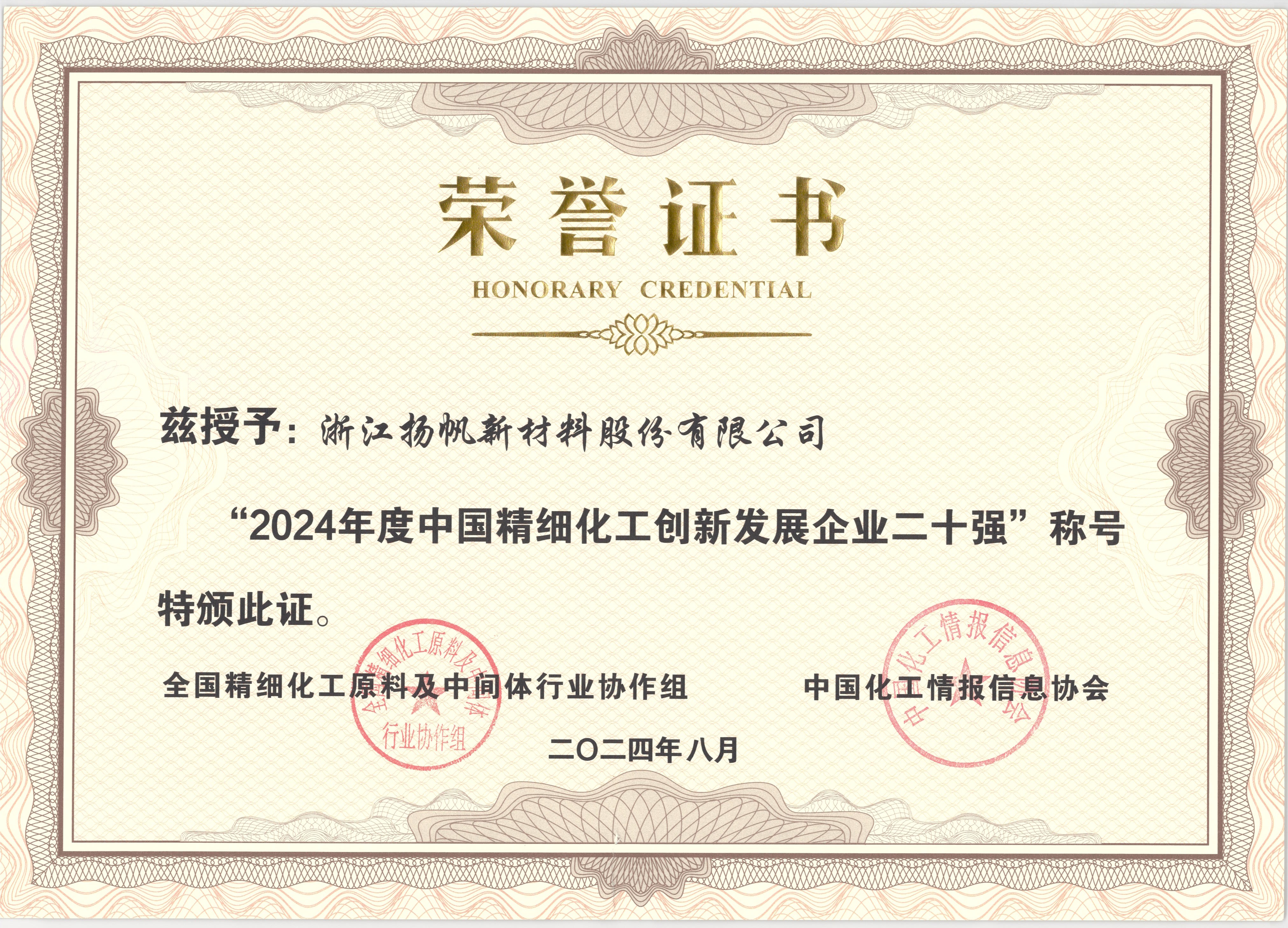 此外,公司榮登“2024年度中國精細化工創(chuàng)新發(fā)展企業(yè)二十強”,位居17位。