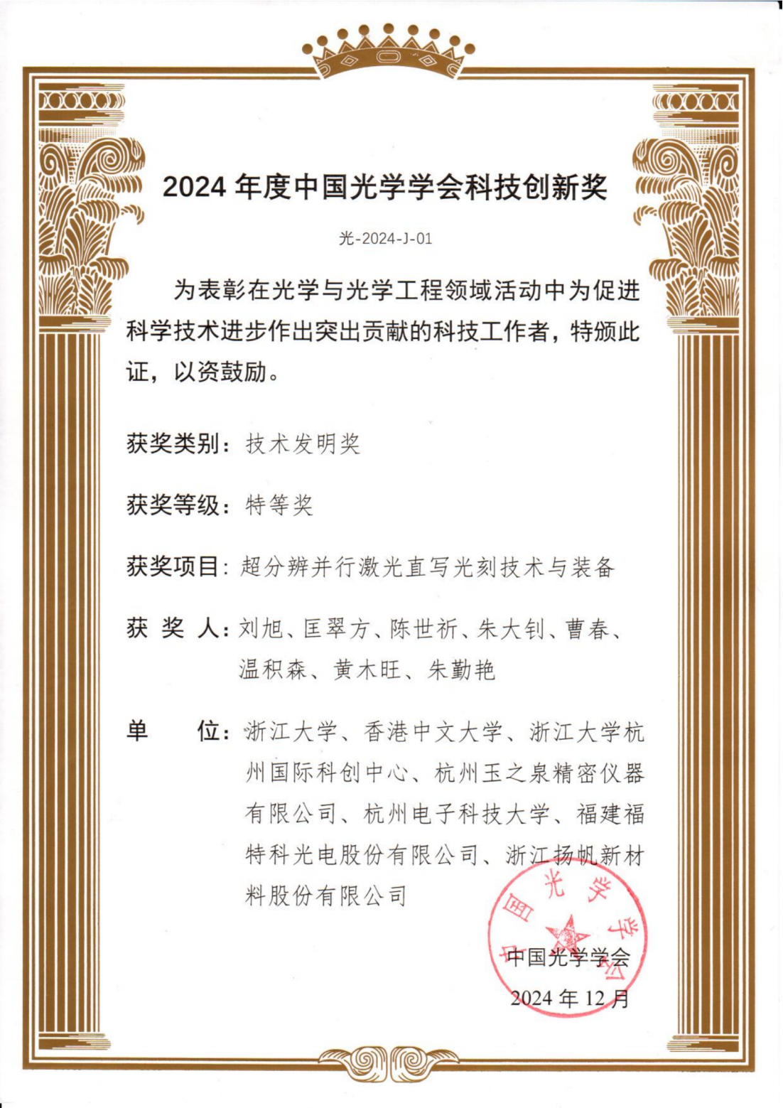 近日,中國(guó)光學(xué)學(xué)會(huì)公布了“2024年度中國(guó)光學(xué)學(xué)會(huì)科技創(chuàng)新獎(jiǎng)評(píng)選結(jié)果”,我司作為參與單位,參與“超分辨并行激光直寫光刻技術(shù)與裝備”項(xiàng)目研發(fā),并榮獲科技創(chuàng)新獎(jiǎng)特等獎(jiǎng)。